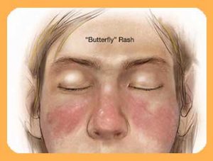อาการทางผิวหนังและเยื่อบุช่องปาก ในระยะเฉียบพลันที่พบได้บ่อยที่สุด คือ ผื่นรูปปีกผีเสื้อ ลักษณะเป็นผื่นบวมแดงนูนบริเวณโหนกแก้มและสันจมูก ผื่นจะเป็นมากขึ้นเมื่อถูกแสงแดด ปลายเท้าซีดเขียวเมื่อถูกน้ำหรืออากาศเย็น ผมร่วง มีแผลในปาก